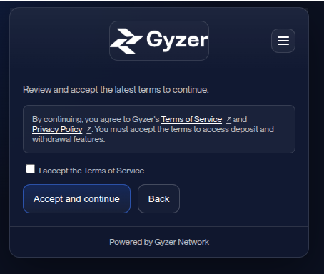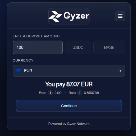 The Gyzer widget is an embeddable interface that lets your users deposit fiat to receive crypto (USDC, USDT, etc.) and withdraw crypto to fiat. It handles KYC verification (SumSub), wallet management, and bank account linking—all within your app’s flow.
